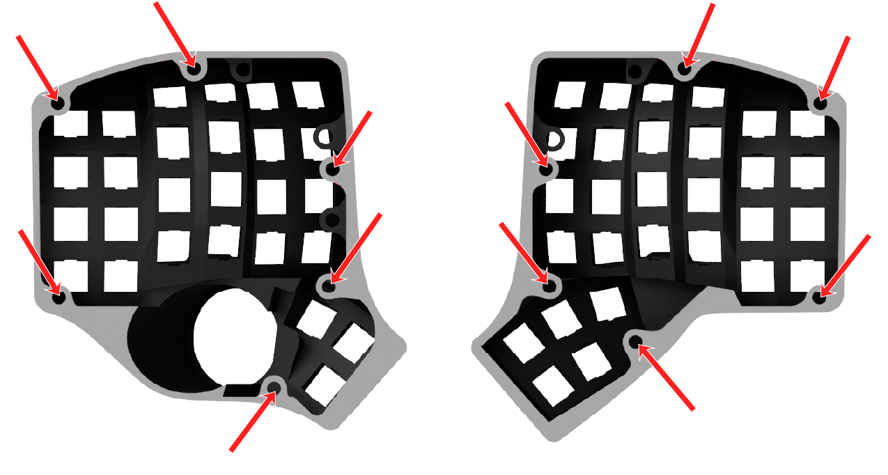 First, we will install the screw inserts on the outer edges of the case. There are 6 on each side. Use the below pictures to identify them.