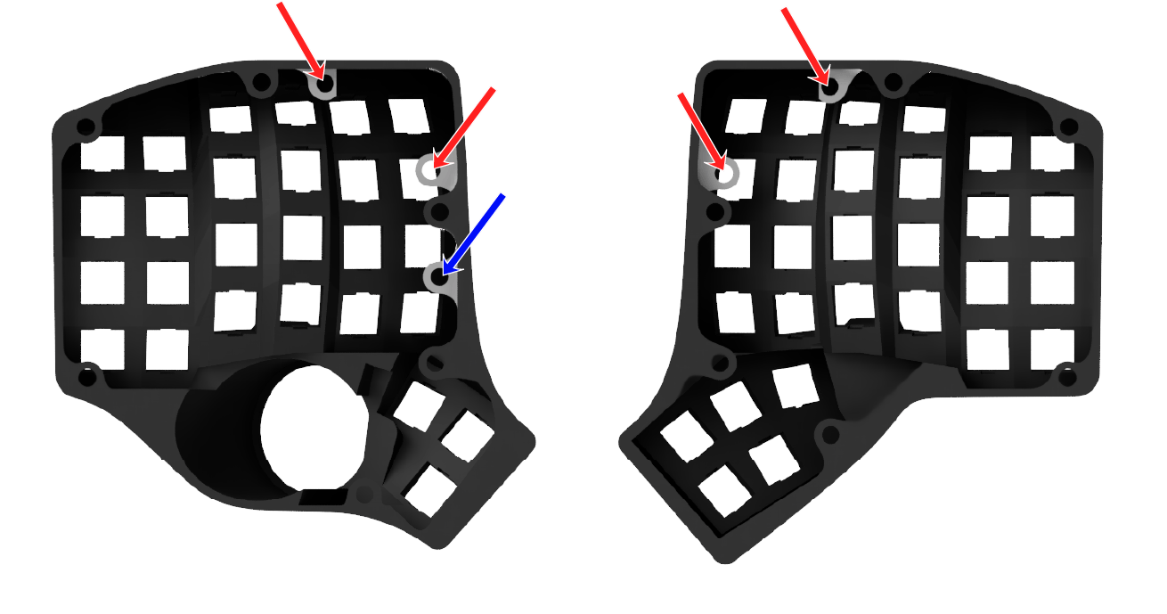 There is a third inner hole at the bottom (in blue). If you are building a left-handed Charybdis, install a screw insert there. Otherwise, you can ignore it.